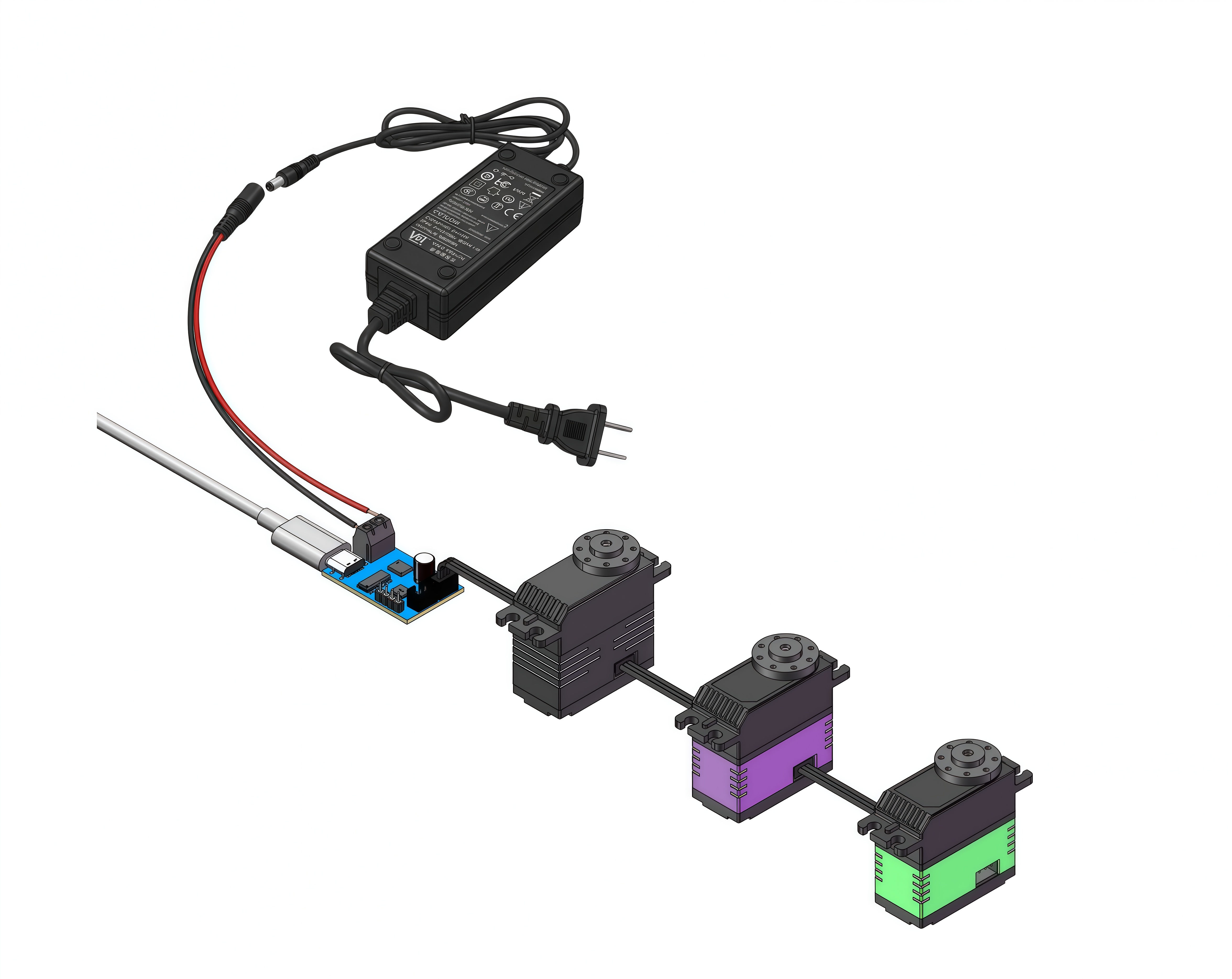- It is recommended that each daisy-chain branch carry no more than 6 servo units, and fewer for high-torque loads.