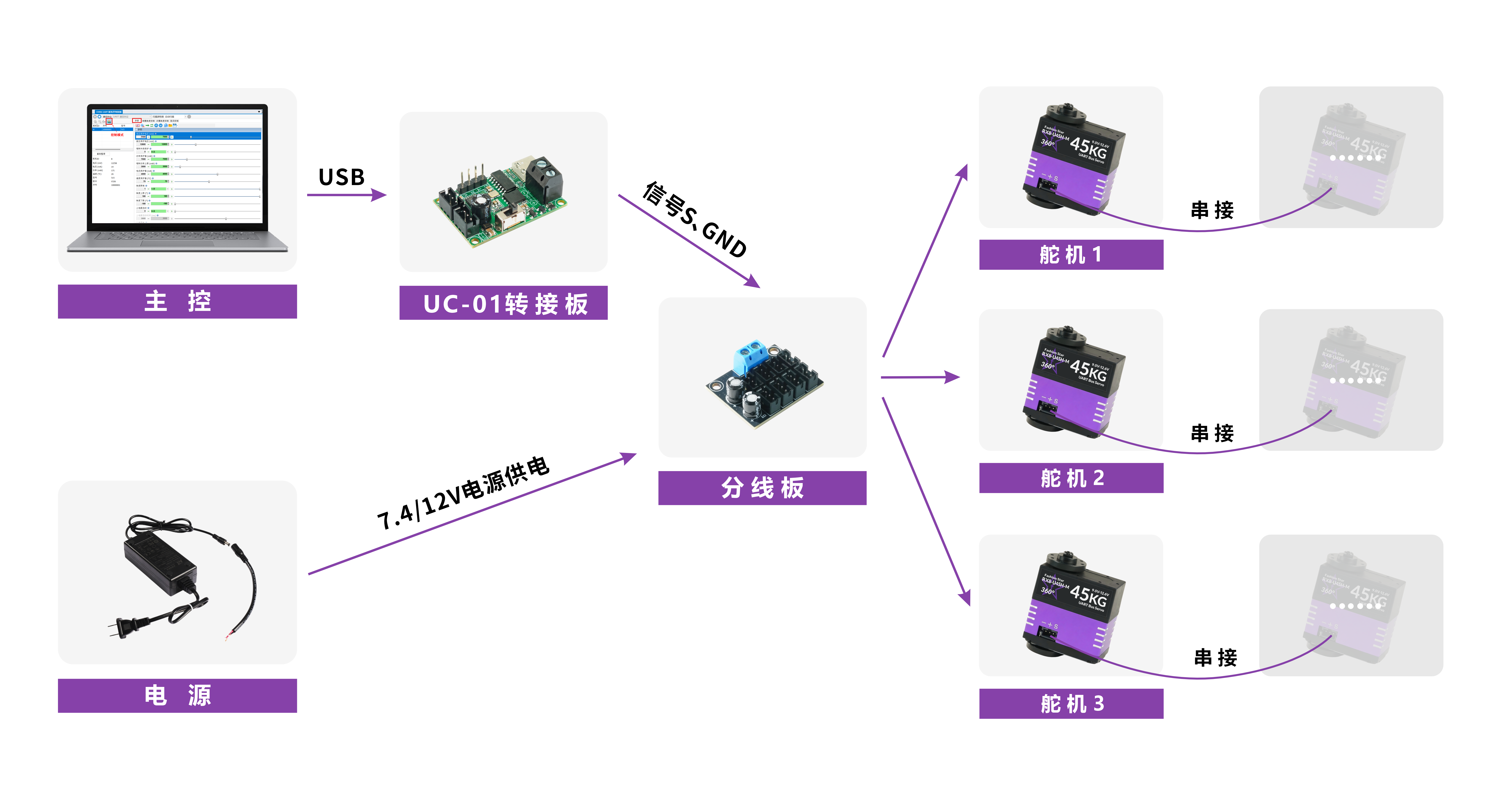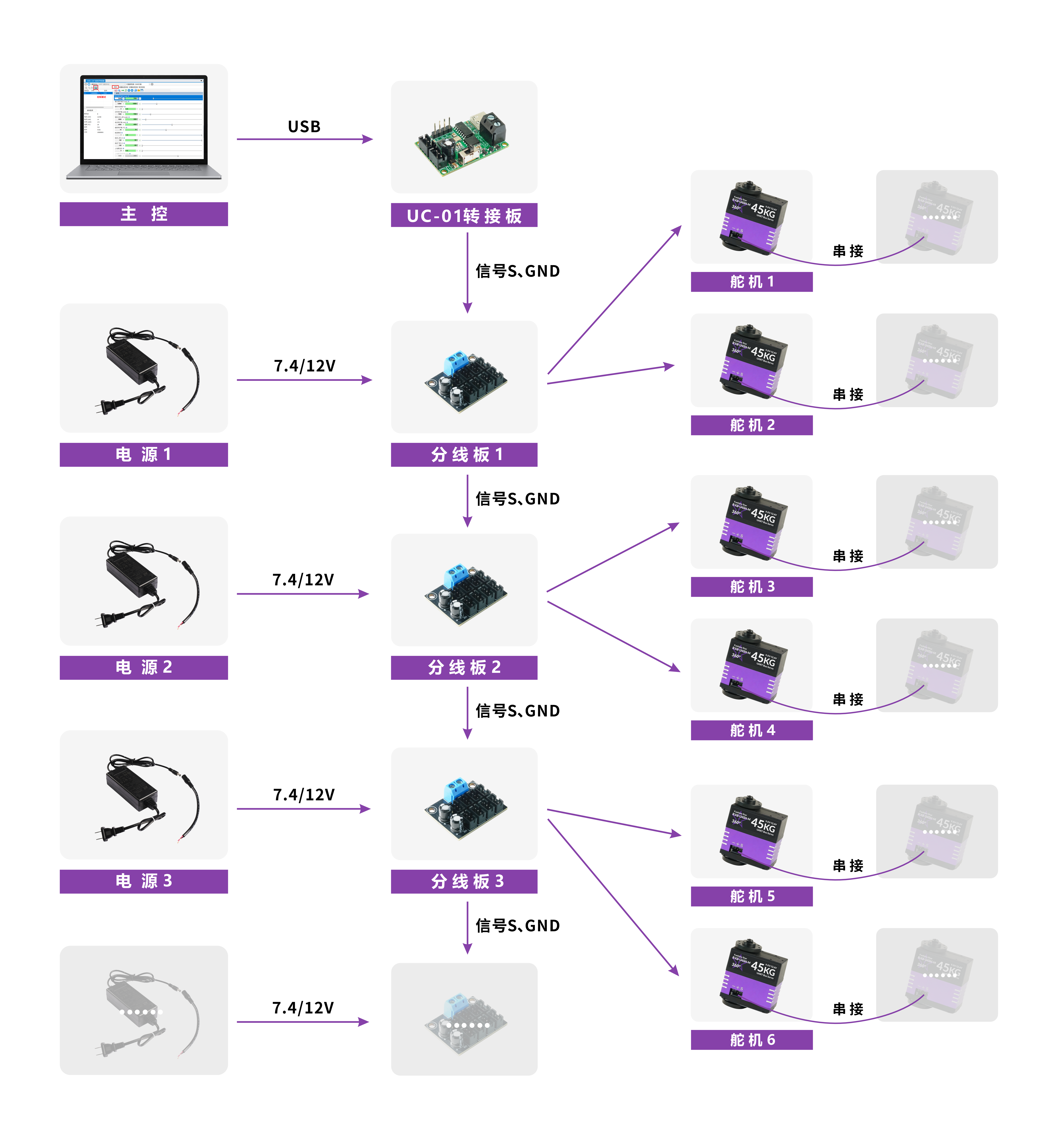 - Once the adapter board is connected to the main controller for communication, all servo units on the full chain can be controlled in a unified way.