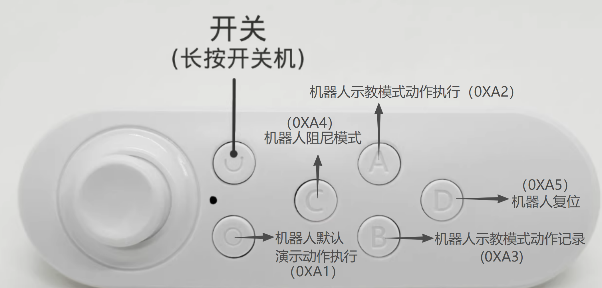 - Bluetooth gamepad: pair with MCU (XIAO_ESP32S3). On success, the robot bows then resets. Buttons map to demo/run/reset/damping/record/speed± as described in the Chinese version.