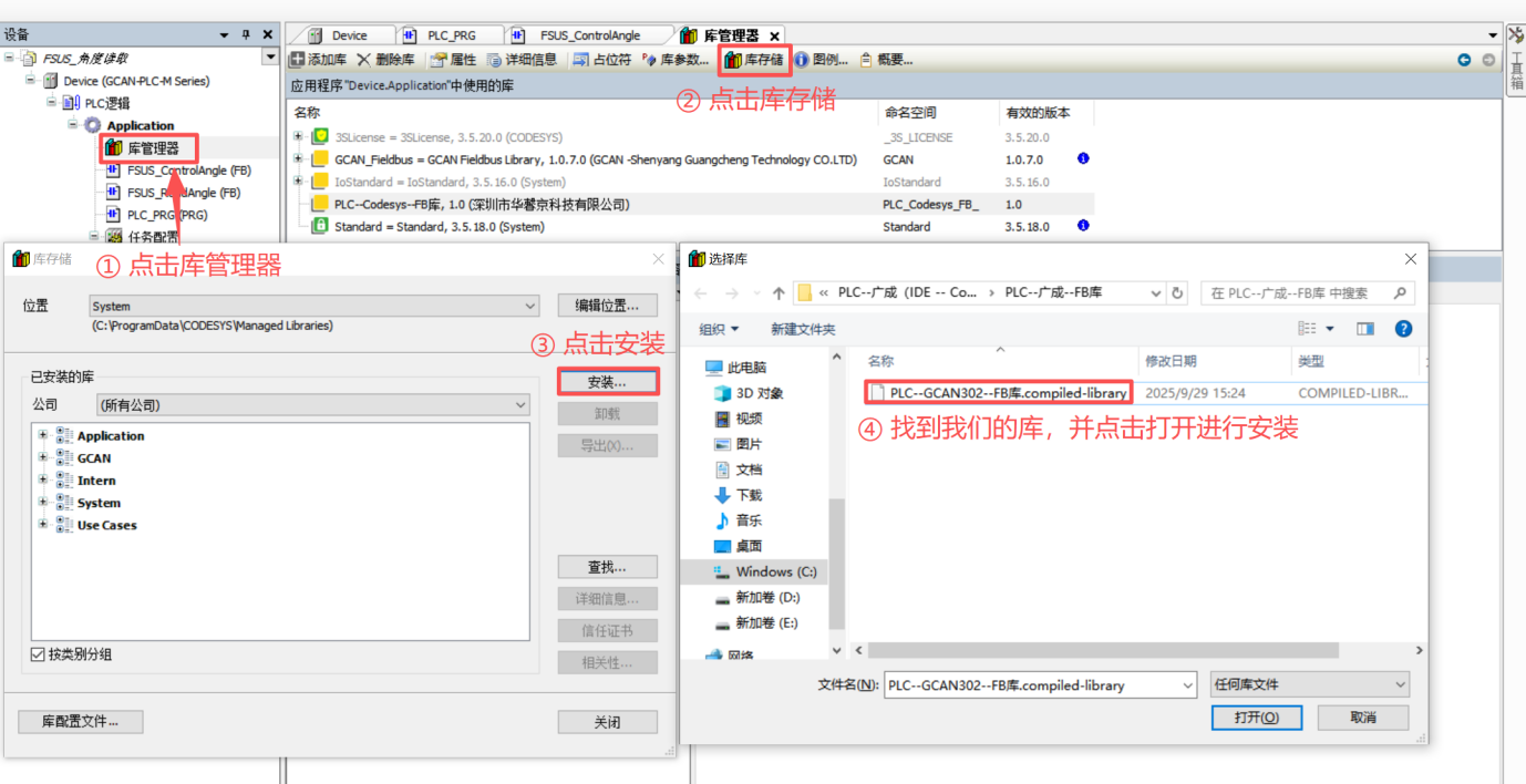 In Codesys, open the Library Manager, click Library Repository, then install FB libraries.
