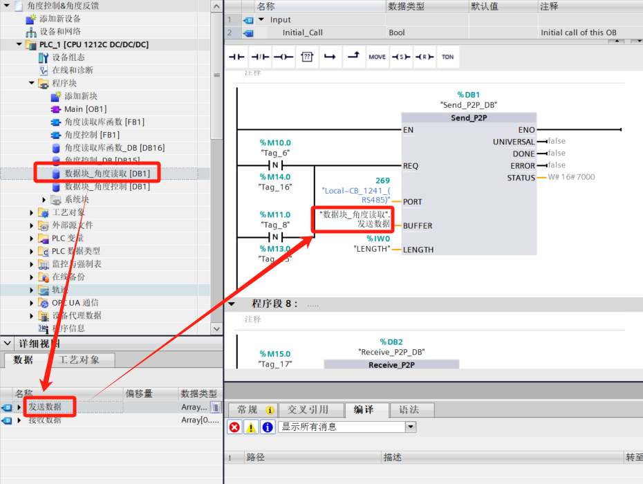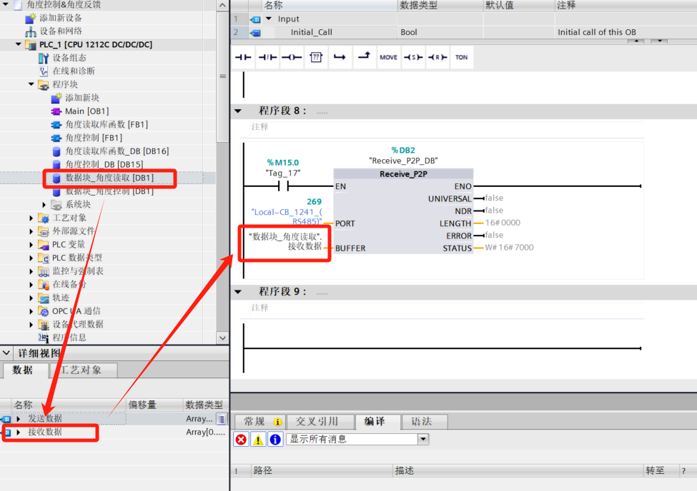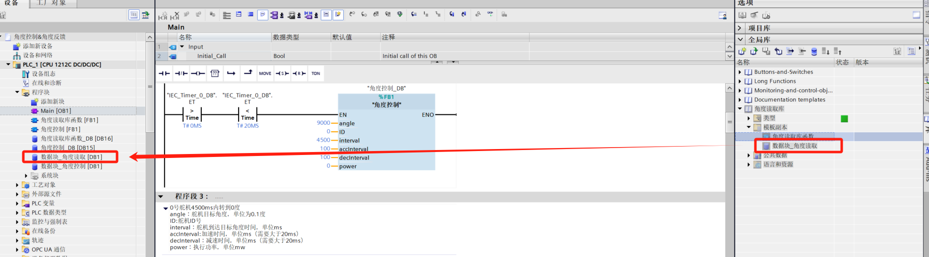 - After loading, drag FB function blocks (library blocks) from Master copies into the program and fill in parameters. Then drag the data block to the leftmost program block.