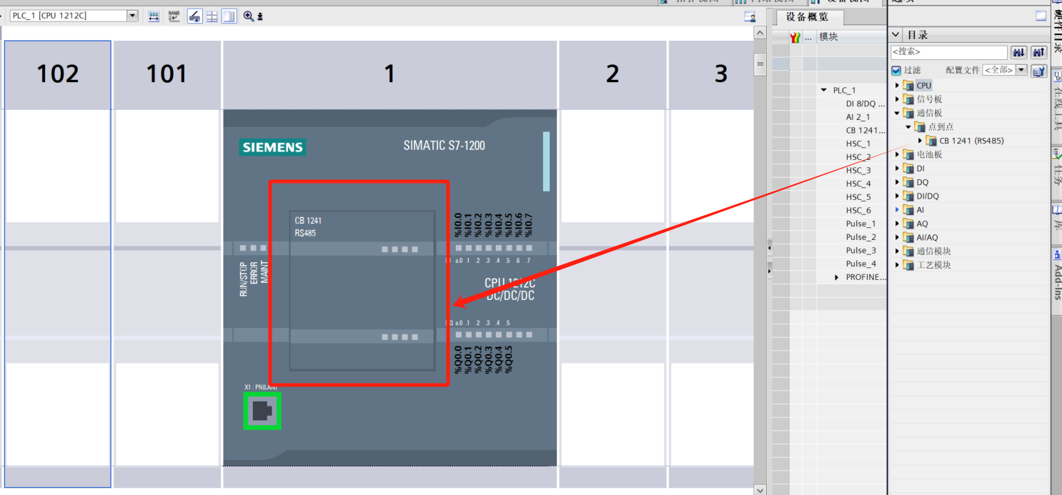 - Add the PLC model in Device Configuration, then add the CB 1241 (RS485) communication board.