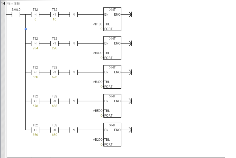 XMTfor send andRCVfor receive.TBLis the send register table;PORTis the send port (port 0 in this example). The program uses timerT32for scheduled sending, with a|N|falling-edge trigger to send once and avoid redundant repeated sends.