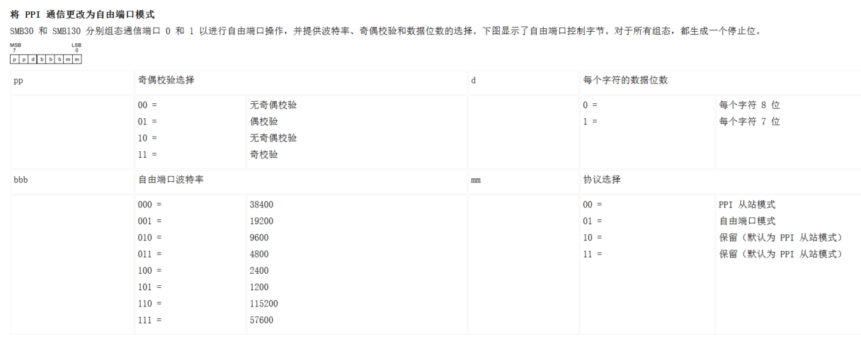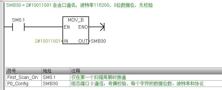 SMB30 = 2#10011001(freeport communication, 115200 baud, 8 data bits, no parity).