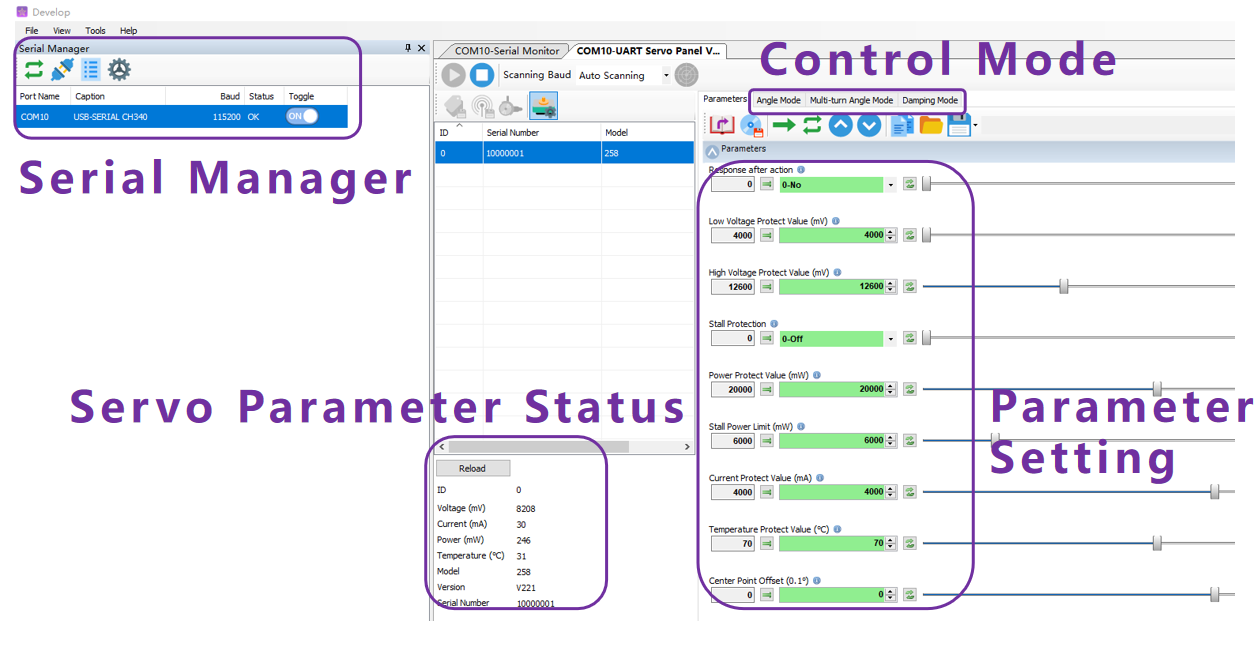This software is a bus servo PC configuration tool used for ID configuration, Parameter setting, real-time motion control, and other functions. It is suitable for development, debugging, and teaching demonstration scenarios.