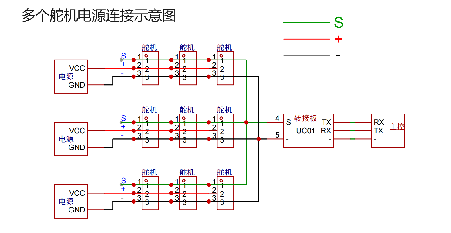 多个舵机串联建议 1. 分组连线原因 多个舵机串联时普通开关电源的电流会不够,电流不够会影响舵机的正常运行,此时可以采用分组供电的方法。 2. 连接示意图 3. 接线视频演示 4. 主要事项 将舵机分为几组,每组单独使用一个电源,每组不超过6个舵机。 组与组之间,组与转接板之间,只需连接信号线(S)与负极(-),转接板再连接主控进行控制。 线修改前 线修改后 舵机与舵机之间的通信距离不能超过1M,如超过1M请使用屏蔽线。 本页内容对您有帮助吗? 感谢您的反馈! 感谢您的反馈!