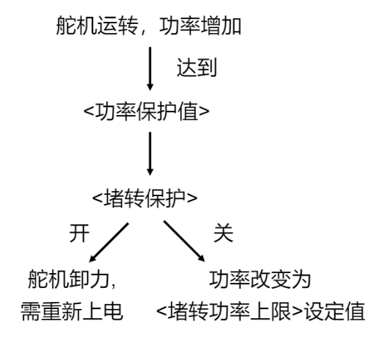 模式二(堵转保护-关):当舵机功率达到设定值A(功率保护值)后,系统会自动调整功率,将其降至一个较低的预设值B(堵转功率上限),确保功率不超过B(注:B<A)。这有助于防止过载并确保设备在安全范围内运行。