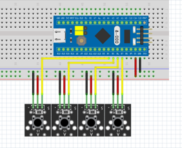 为了接线方便,这里使用的是四位独立按键模块,你也可以使用四个按键模块,或者在面包板上搭建电路。