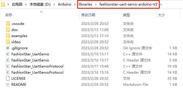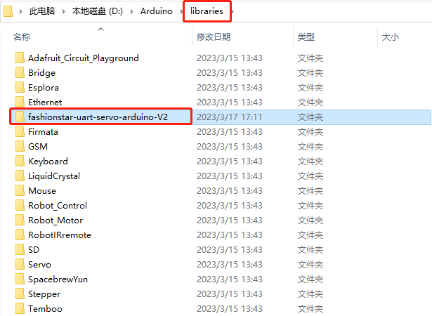 将fashionstar-uart-servo-arduino-V2这个工程文件,整体拷贝到Arduino IDE安装路径下的libraries这个文件夹: