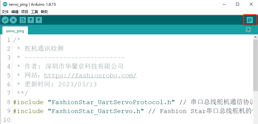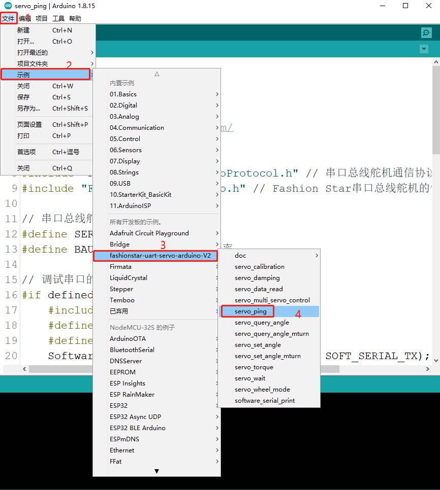 · 在PC端打开Arduino IDE,打开FashionStar总线伺服舵机的例程文件: