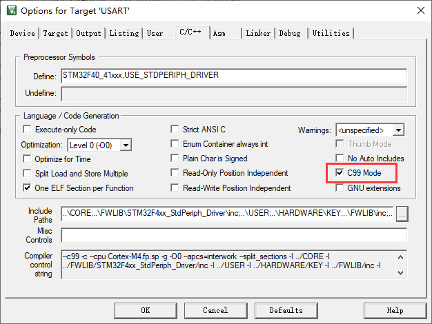 正点原子的代码示例,默认C99选项没有被勾选,需要手动勾选。
