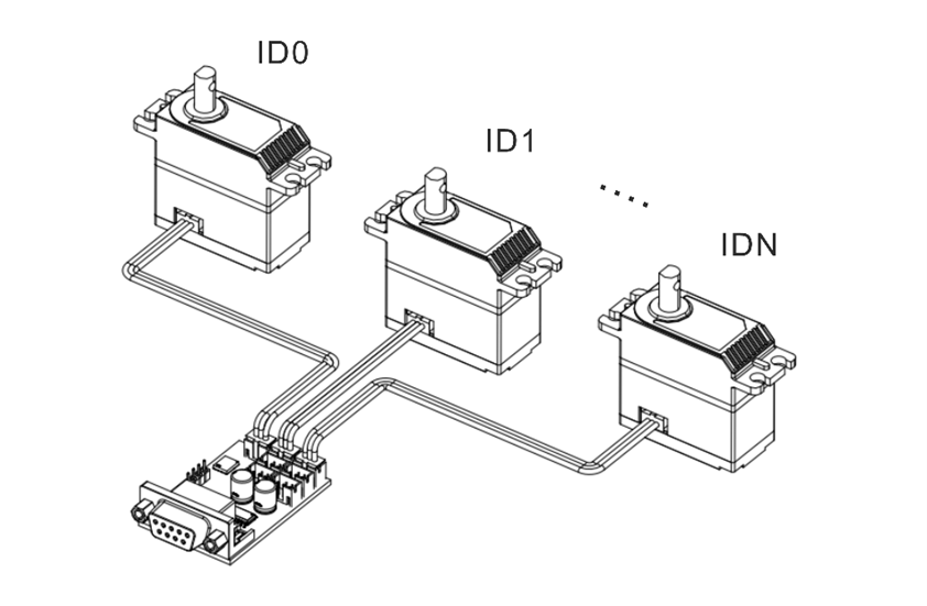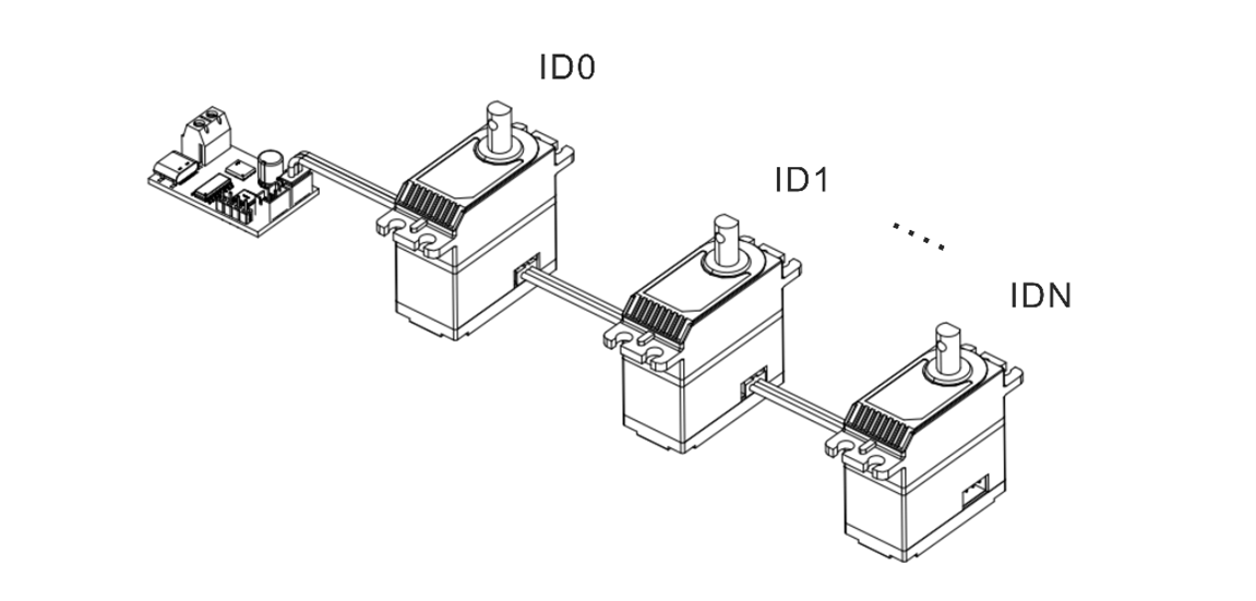 - 每个伺服舵机通过唯一的 ID 与指令内容中的参数进行匹配,仅解析并响应与自身 ID 相关的控制信息。
