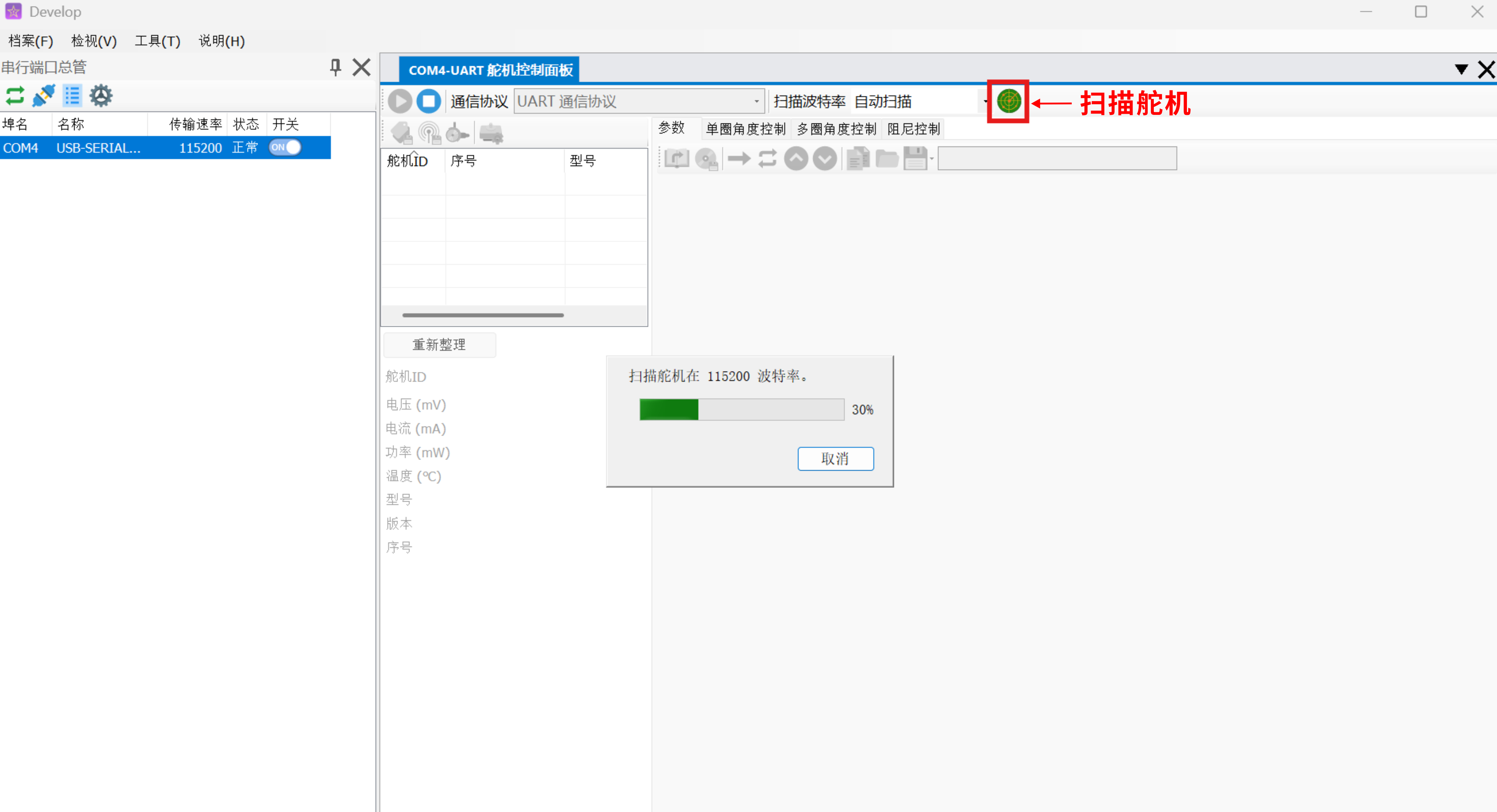 点击 扫描舵机 按钮,软件开始自动扫描;