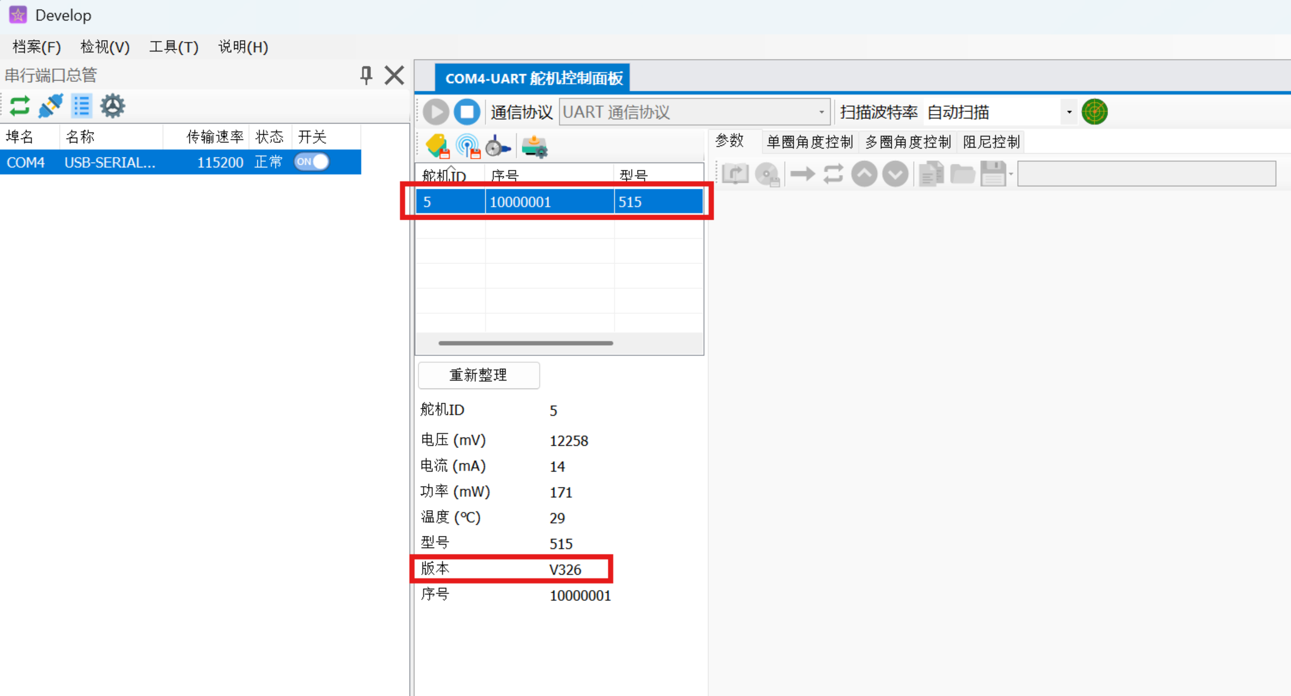 列表中同时显示舵机固件版本信息,便于后续 固件升级 参考。