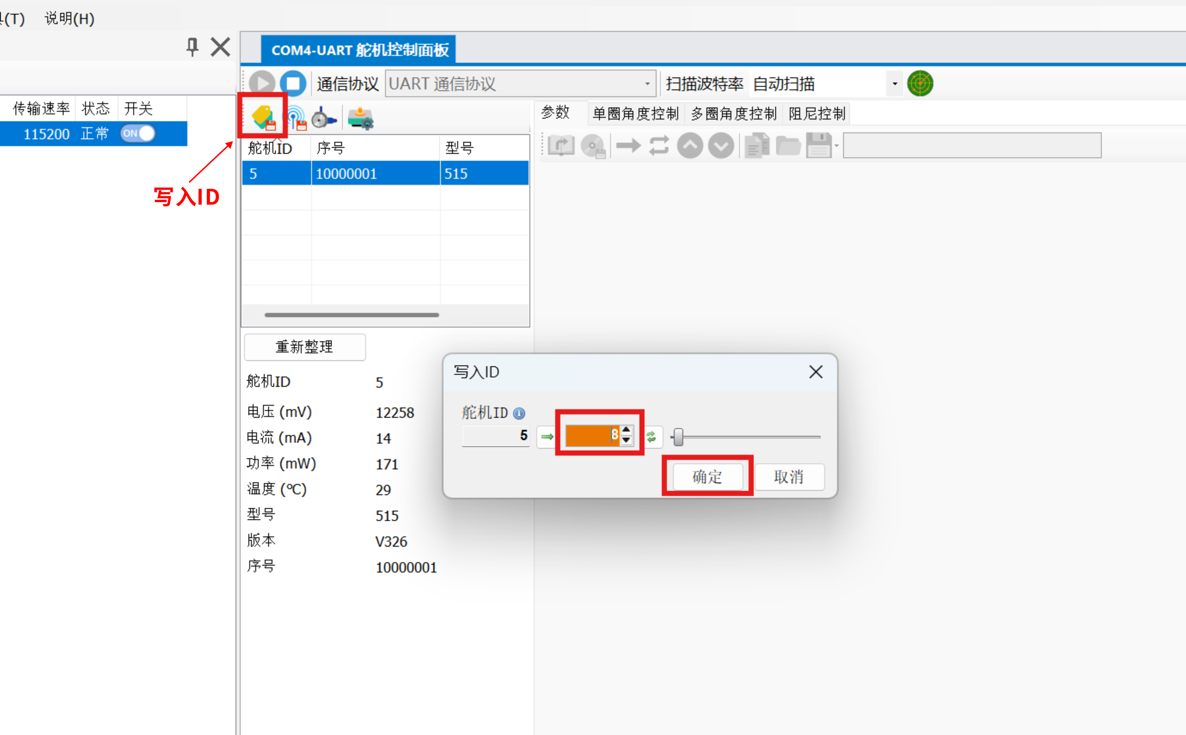 - 点击 确认,软件会再次自动扫描舵机,并在修改的波特率找到该舵机;