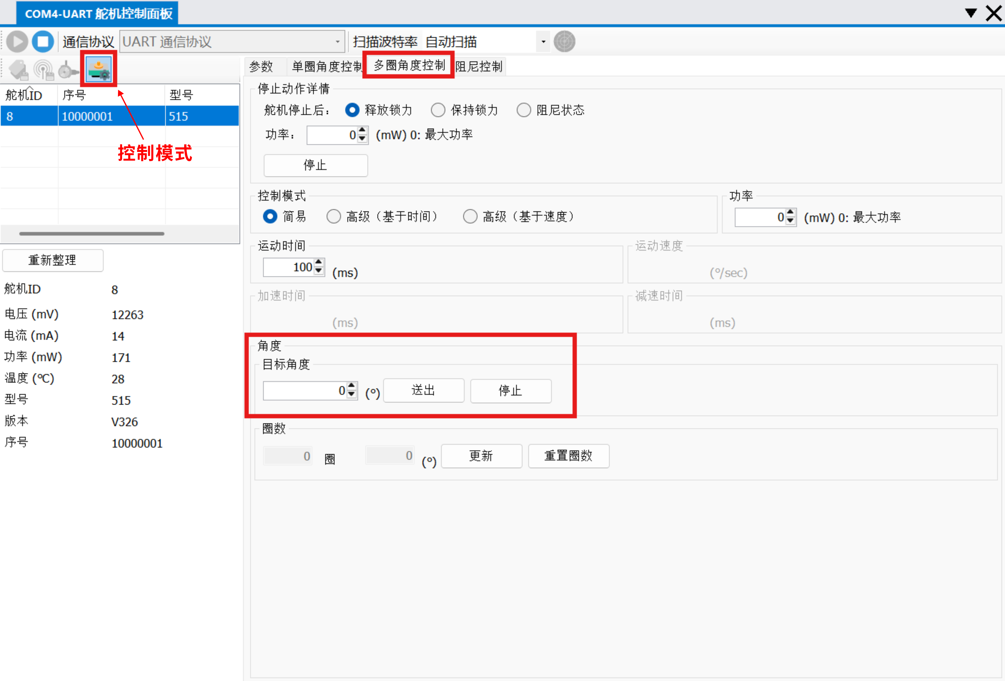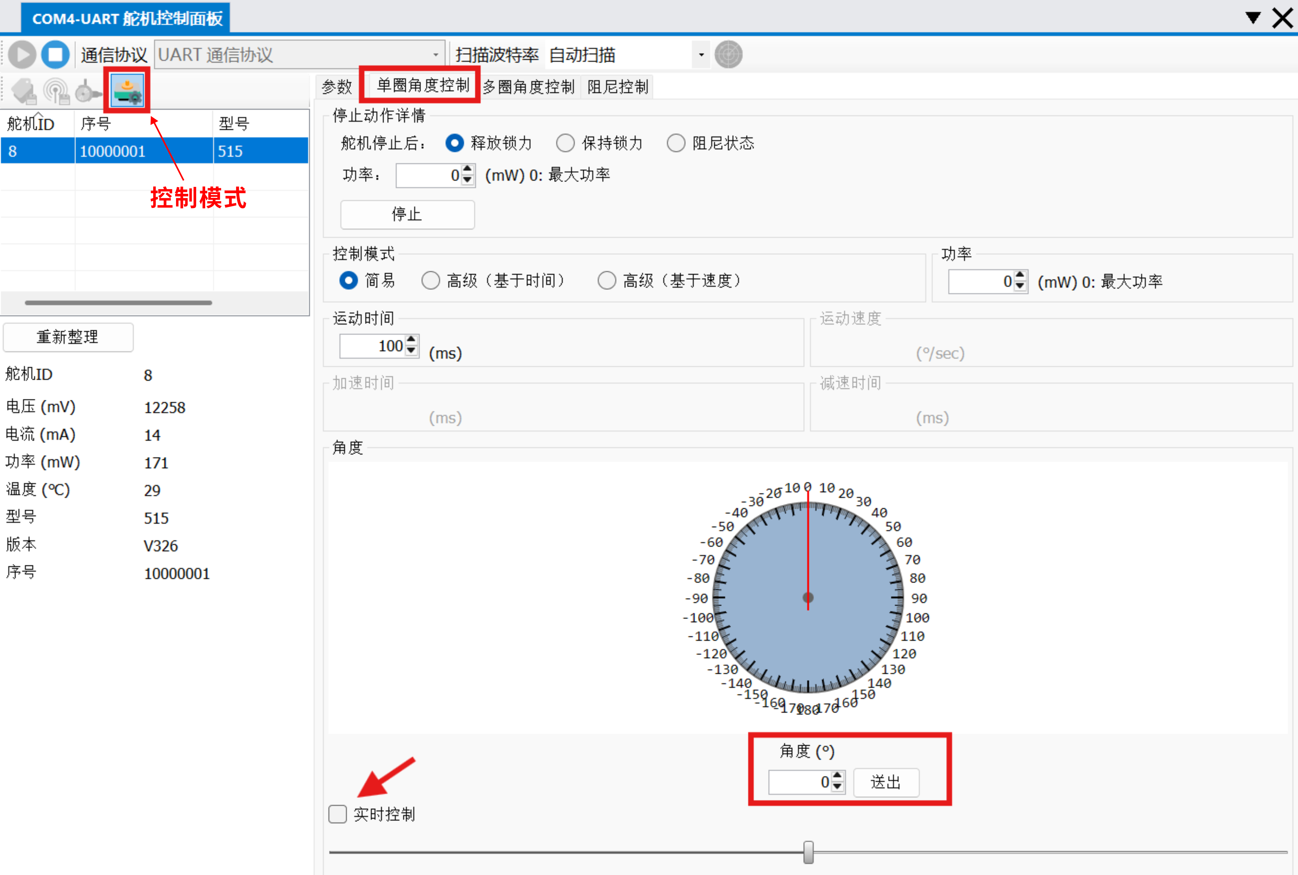- 按需设置 控制模式 参数;输入目标角度并点击 送出,舵机会运动到目标角度;