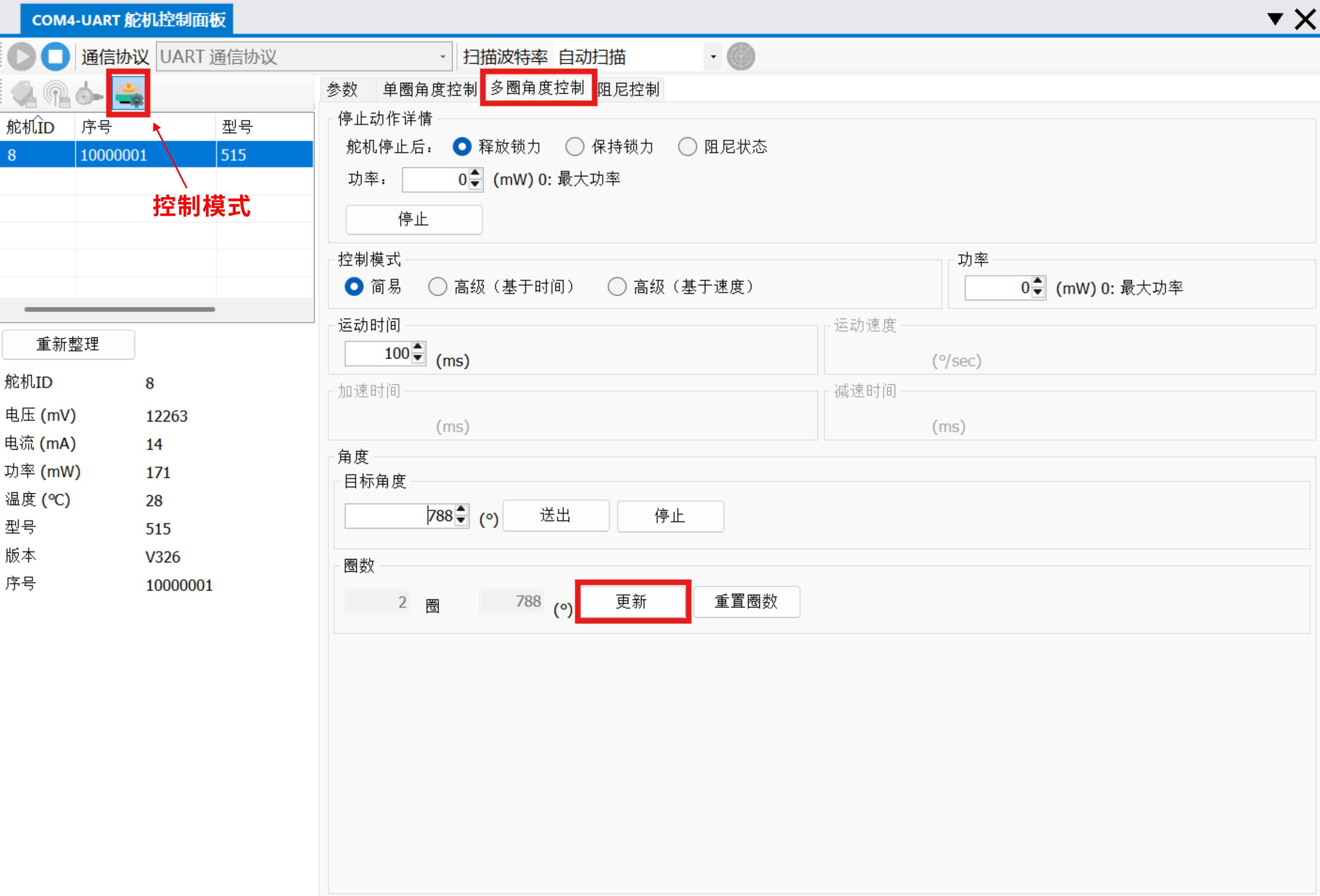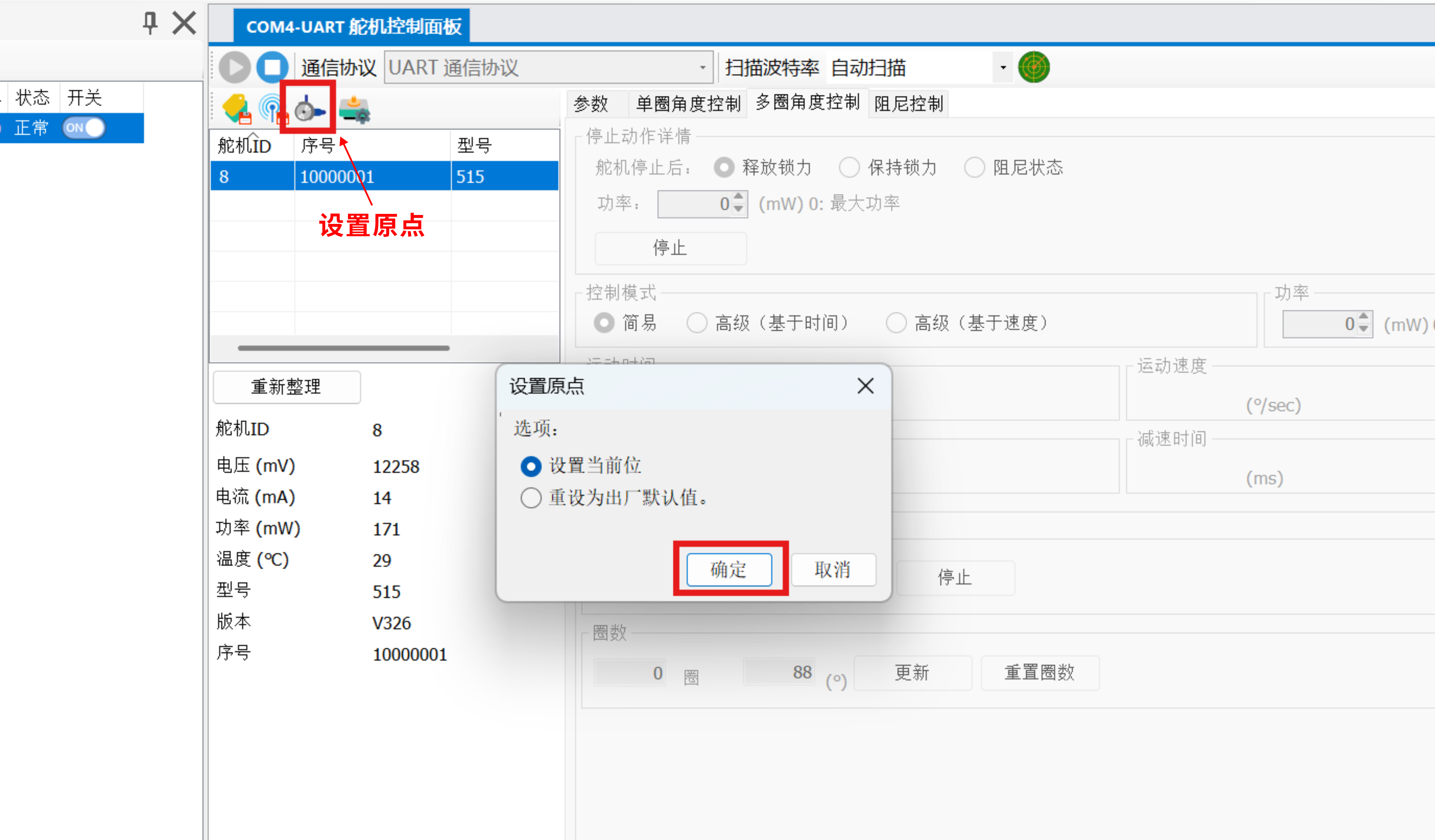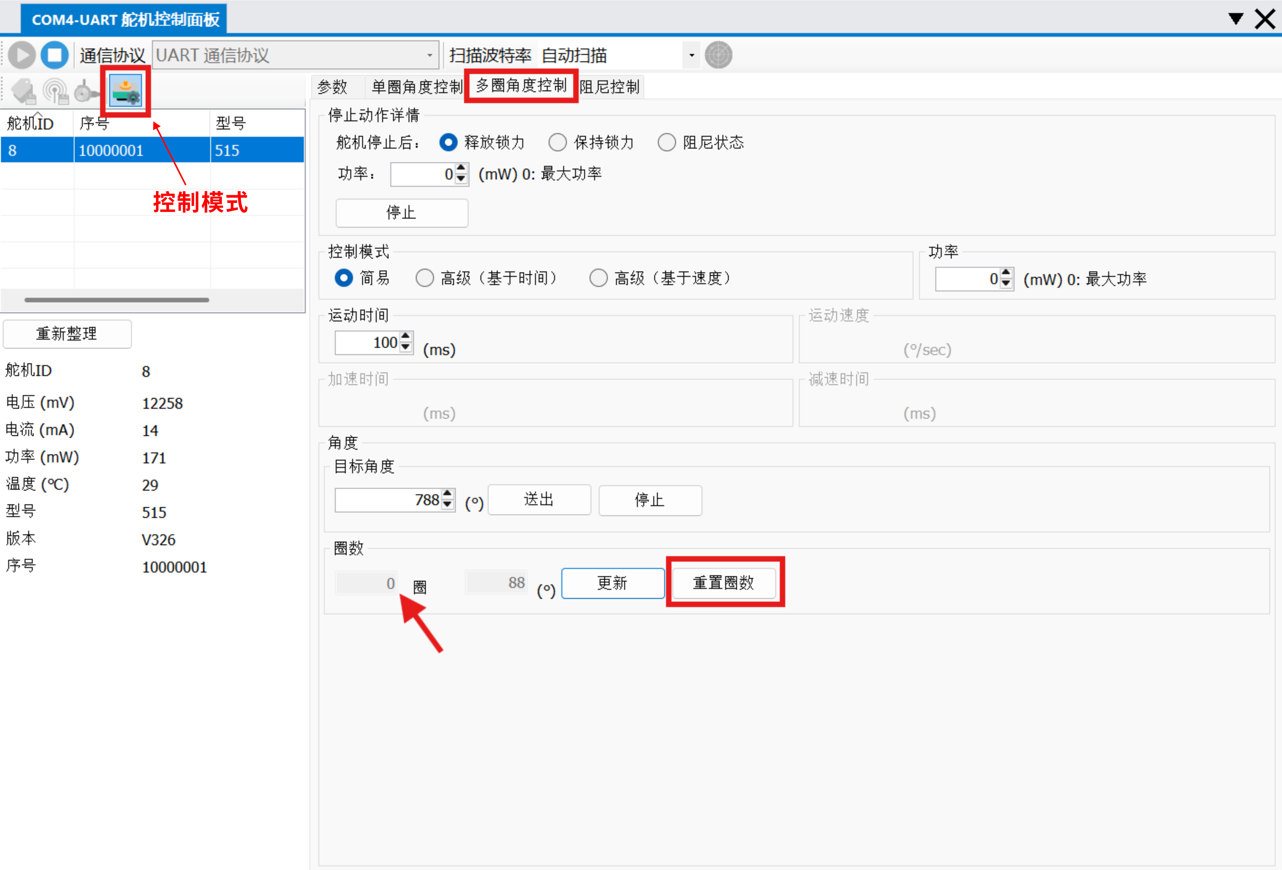 - 点击 重置圈数,清除舵机记录的圈数信息,当前角度将被保留;