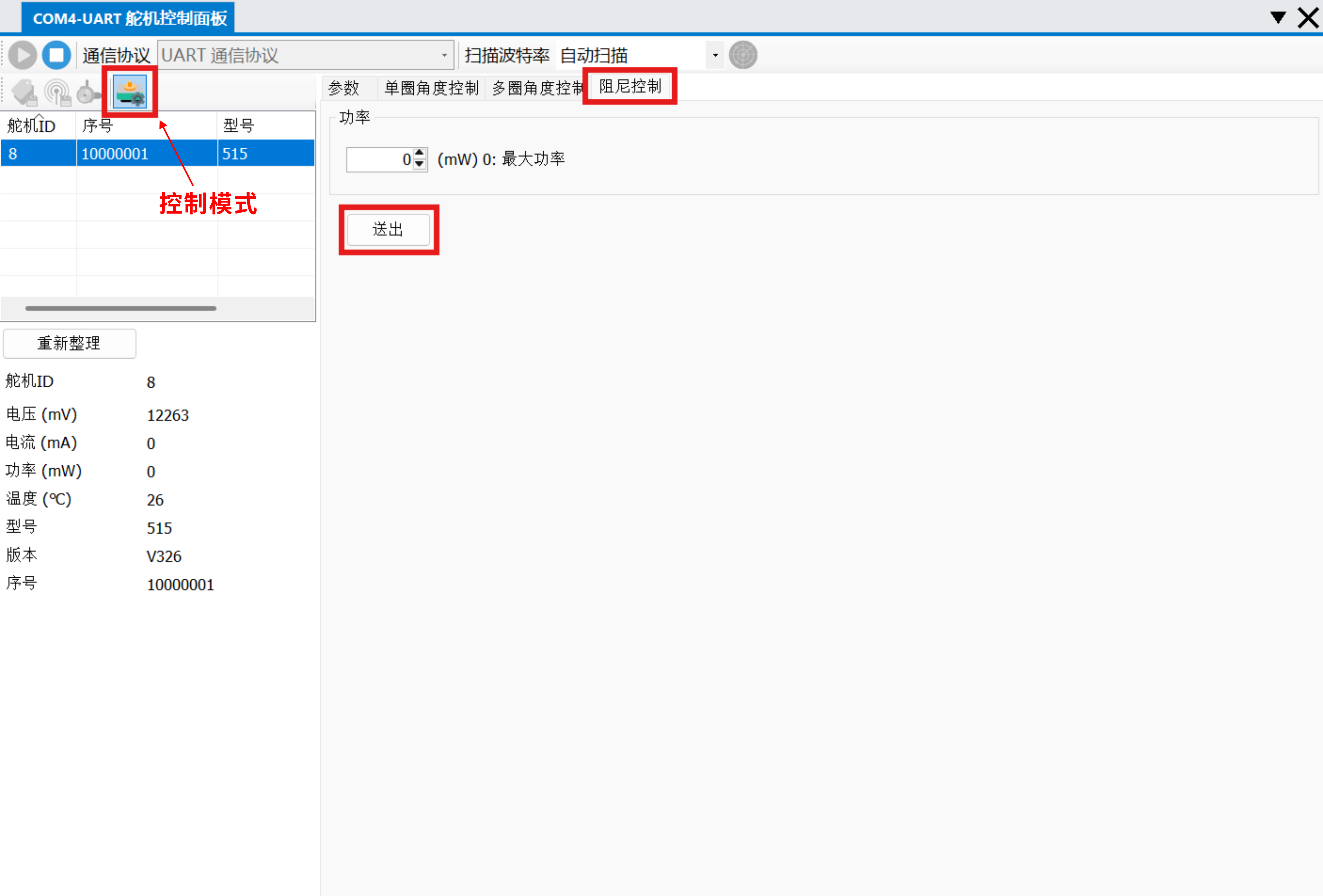 - 按需设置 功率 参数;并点击 送出,此时,用外力转动舵机会有阻尼的效果;