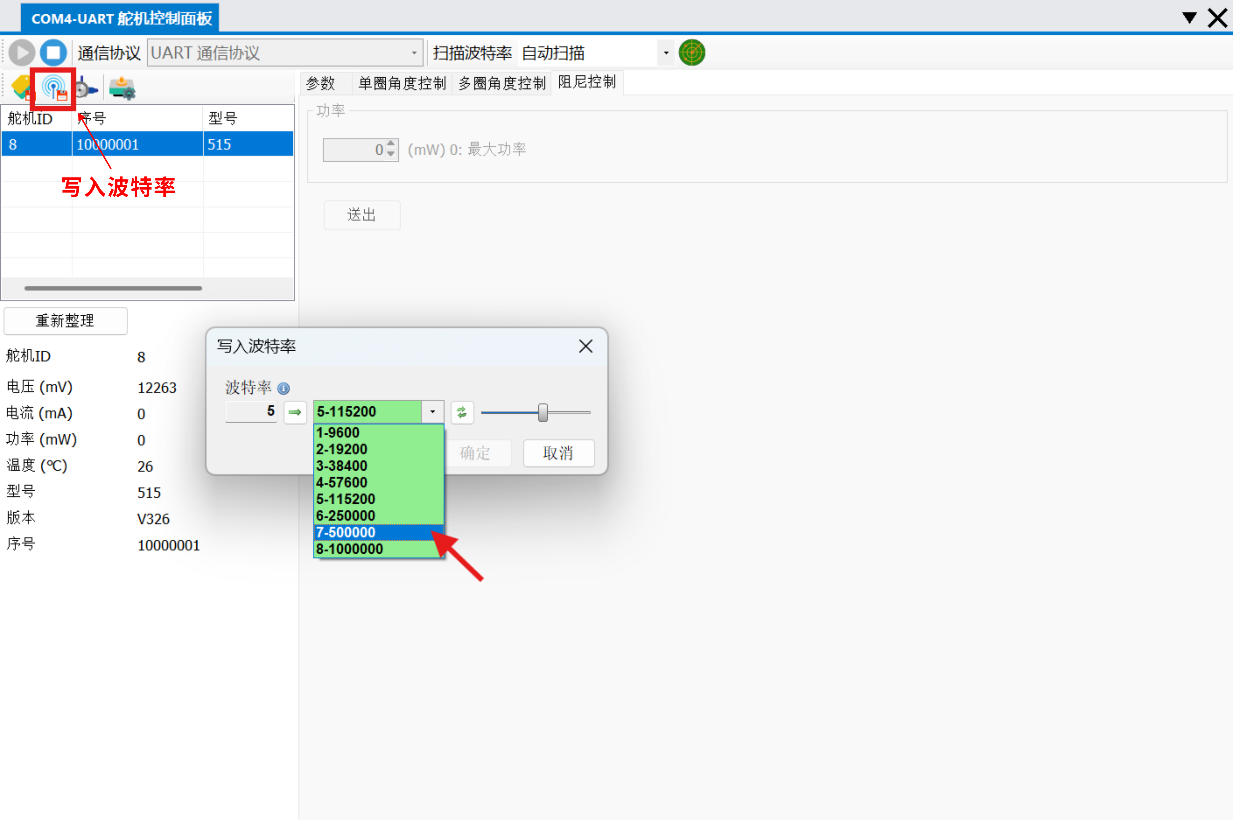 - 点击 写入波特率 按钮,在弹窗中选择希望修改的波特率选项;