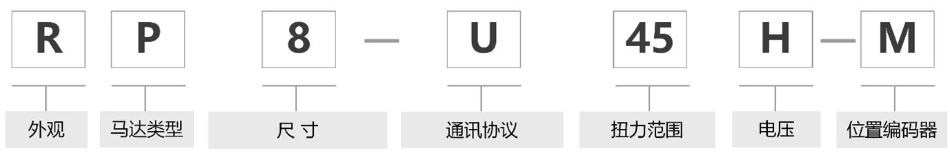 | H: 单轴 | P: 空心杯 | 8: 40×20×40mm | S: 分布式串行总线 | H: 12V | M: 绝对值位置编码器(磁编码) |